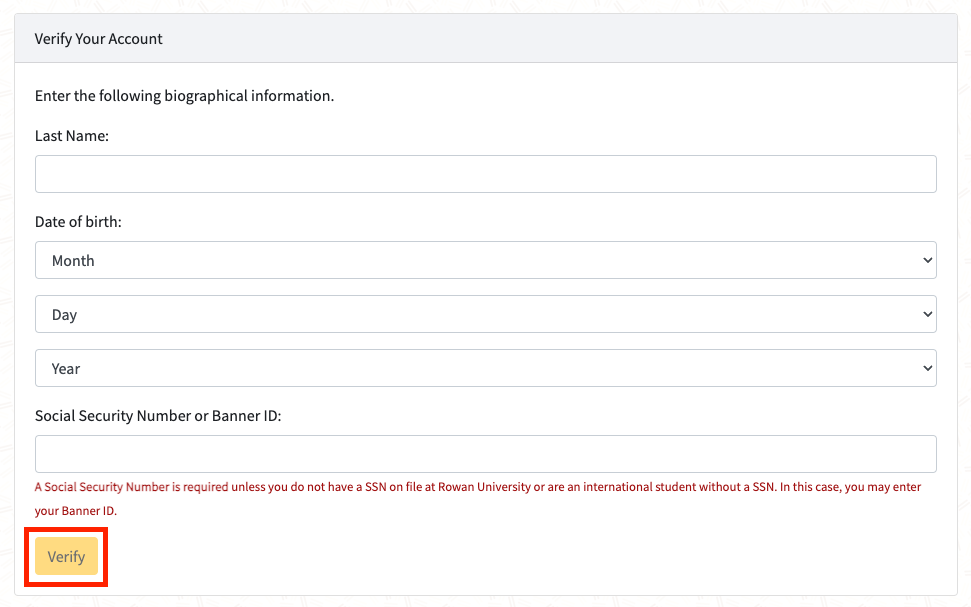 Note: If you are having trouble logging in, try clearing your cache or using a private/different browser. If you are still unable to log in, please call the Technology Support Center at 856-256-4400 for assistance. - Enter your biographical information and click Verify.