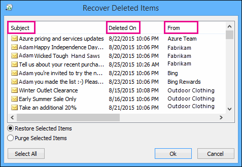 Note: You can recover email messages, contacts, calendar items and tasks from the Recoverable Items folder. When you recover items from the Recoverable Items folder, they are moved to the Deleted Items folder. So after you recover an item, you can find it in your Deleted Items folder and then move it to another folder. If you recover a calendar appointment, contact or task, it's also moved to the Deleted Items folder. From there, you can move it back to your calendar, contact list or tasks. To find recovered items, just search for them in the Deleted Items folder.