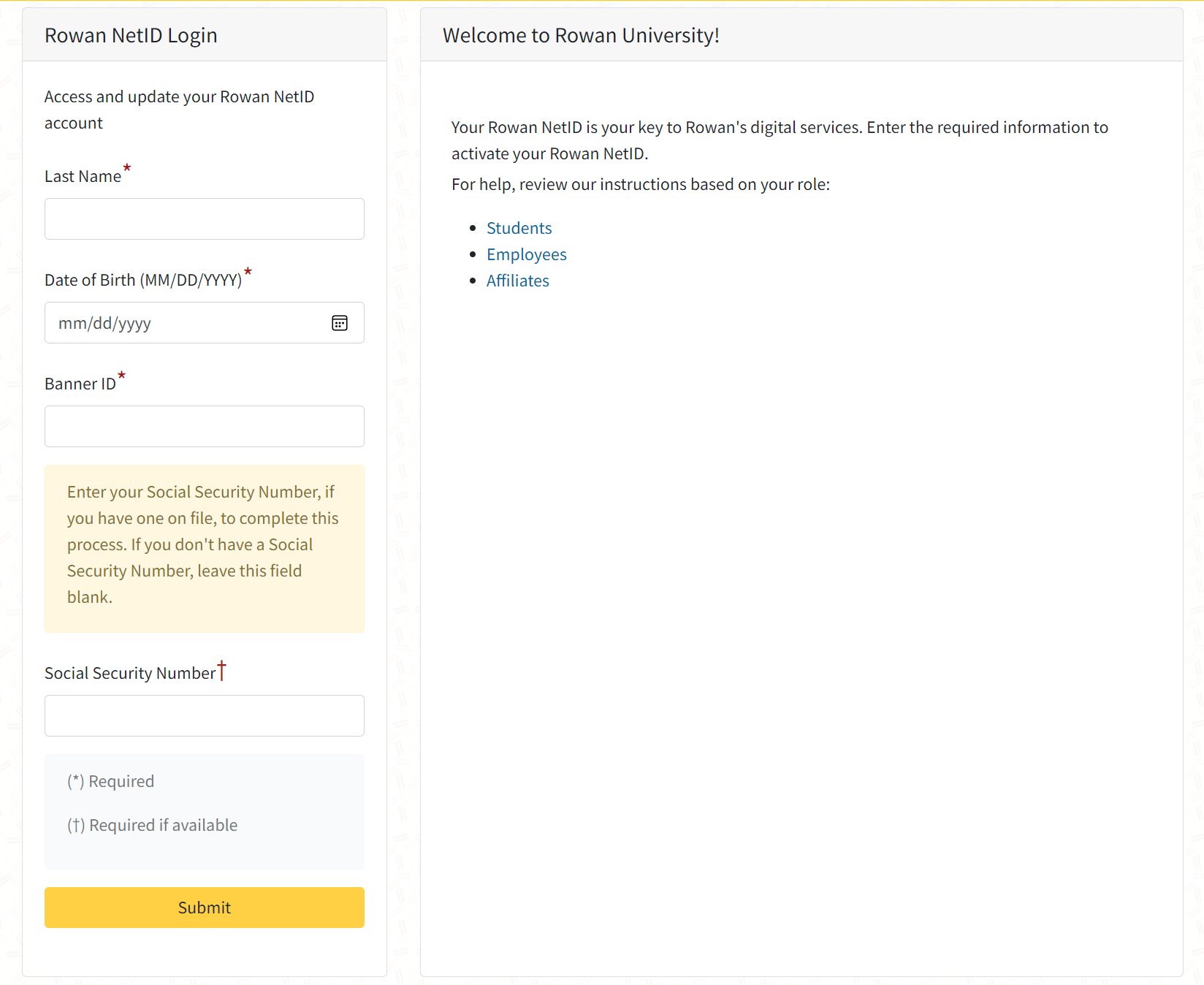 NOTE: If you do not have a Social Security number on file with Rowan University, you may leave that field empty.