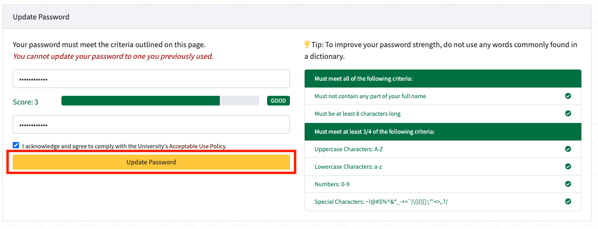 Note: It is also a good idea to enroll in our emergency contact system, RAVE. This may be required depending on your role at the University. - Finally, you will be able to update your password by using the "Update Password" button in the navigation panel. If there are any other missing requirements for your account, you will be notified on this page. Enter and verify your new password, and click Update Password.