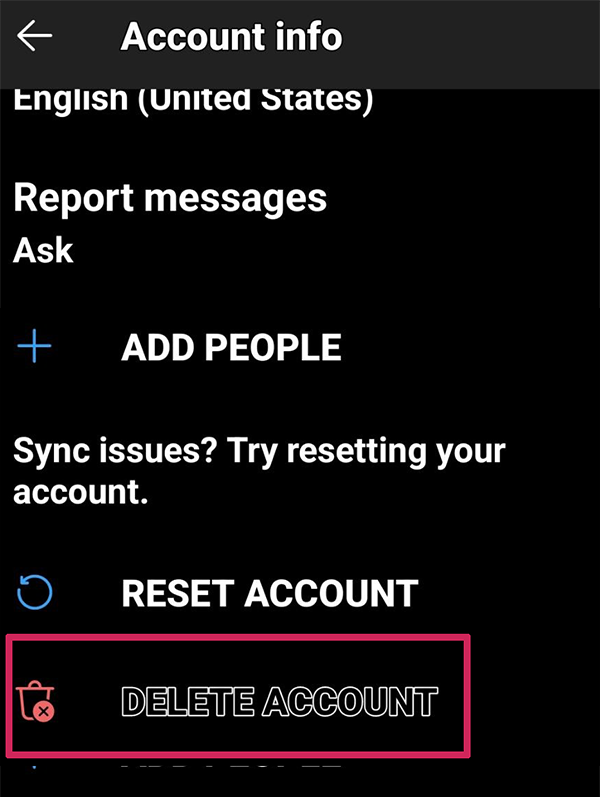 4. Scroll down and select Delete Account, and then Delete. You may also get a prompt to remove data. Continue with the deletion.