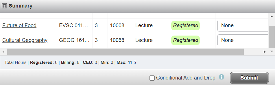 7. The courses will appear on the bottom right corner of the screen with a pending status. Select Submit