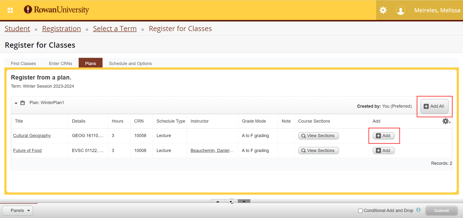 6. You will see the plans you created. You can either select +Add All to add all the courses from one plan or you can select +Add to add courses one by one. If there is no CRN listed for a course, select View Sections to choose a section.