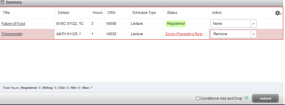 Note: If you did not successfully register for a course, review Section Tally and ask yourself the following:  1) Did the course in your plan have a CRN number listed? 2) Are seats available in the course? 3) Do you have the pre-requisites for the course? 4) Are there restrictions for the course?