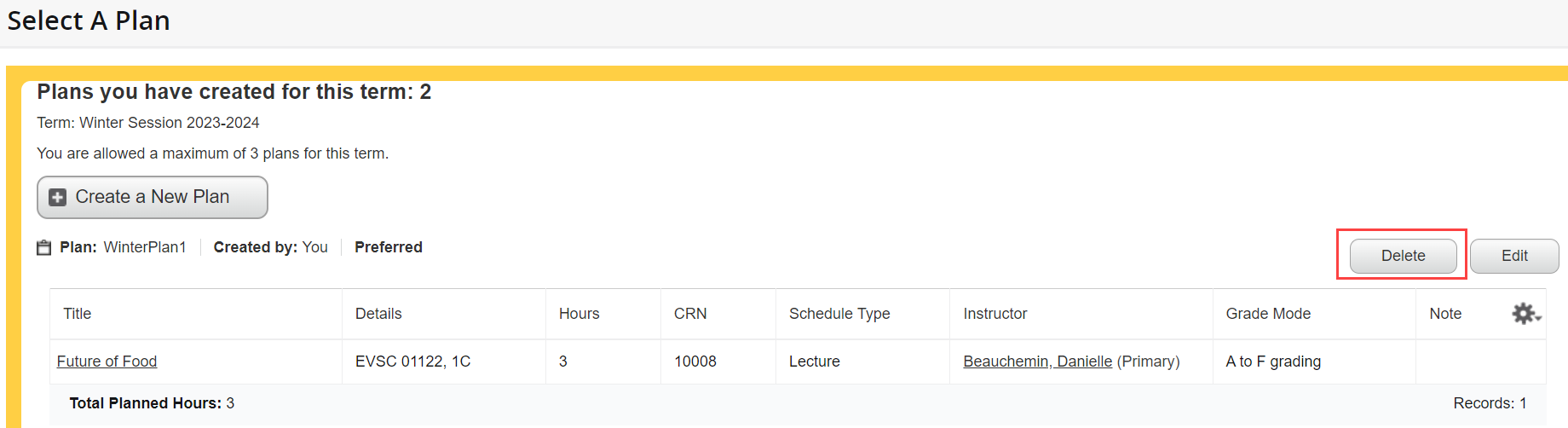15. Use the Select a Plan link at the top of the screen to review the plan or create another one. You can create a maximum of 3 plans per term.