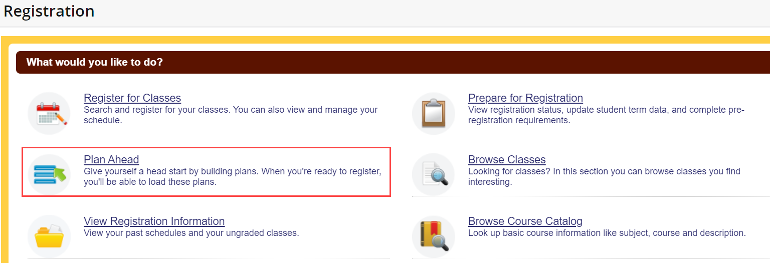 Students can use the Plan Ahead feature in Self-Service Banner to create preferred course schedules for upcoming terms in preparation for their registration time. Once a student's registration window opens, they can use the planned courses to register quickly and easily.